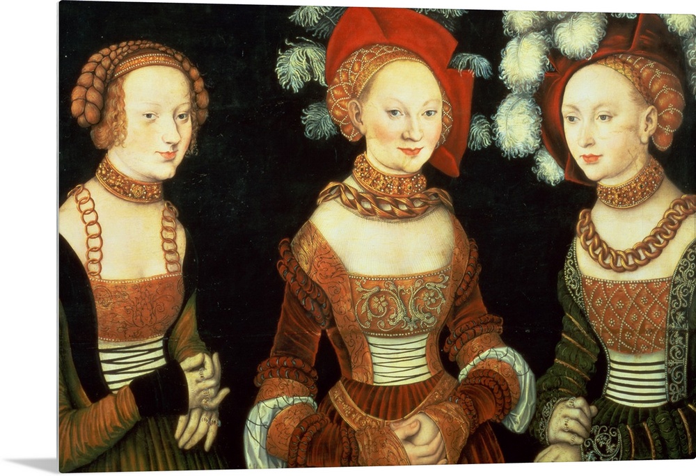 <p>XAM72406 Three princesses of Saxony, Sibylla (1515-92), Emilia (1516-91) and Sidonia (1518-75), daughters of Duke Heinrich of Frommen, c.1535 (panel); by Cranach, Lucas, the Elder (1472-1553); oil on panel; 62x89 cm; Kunsthistorisches Museum, Vienna, Austria; German, out of copyright</p>