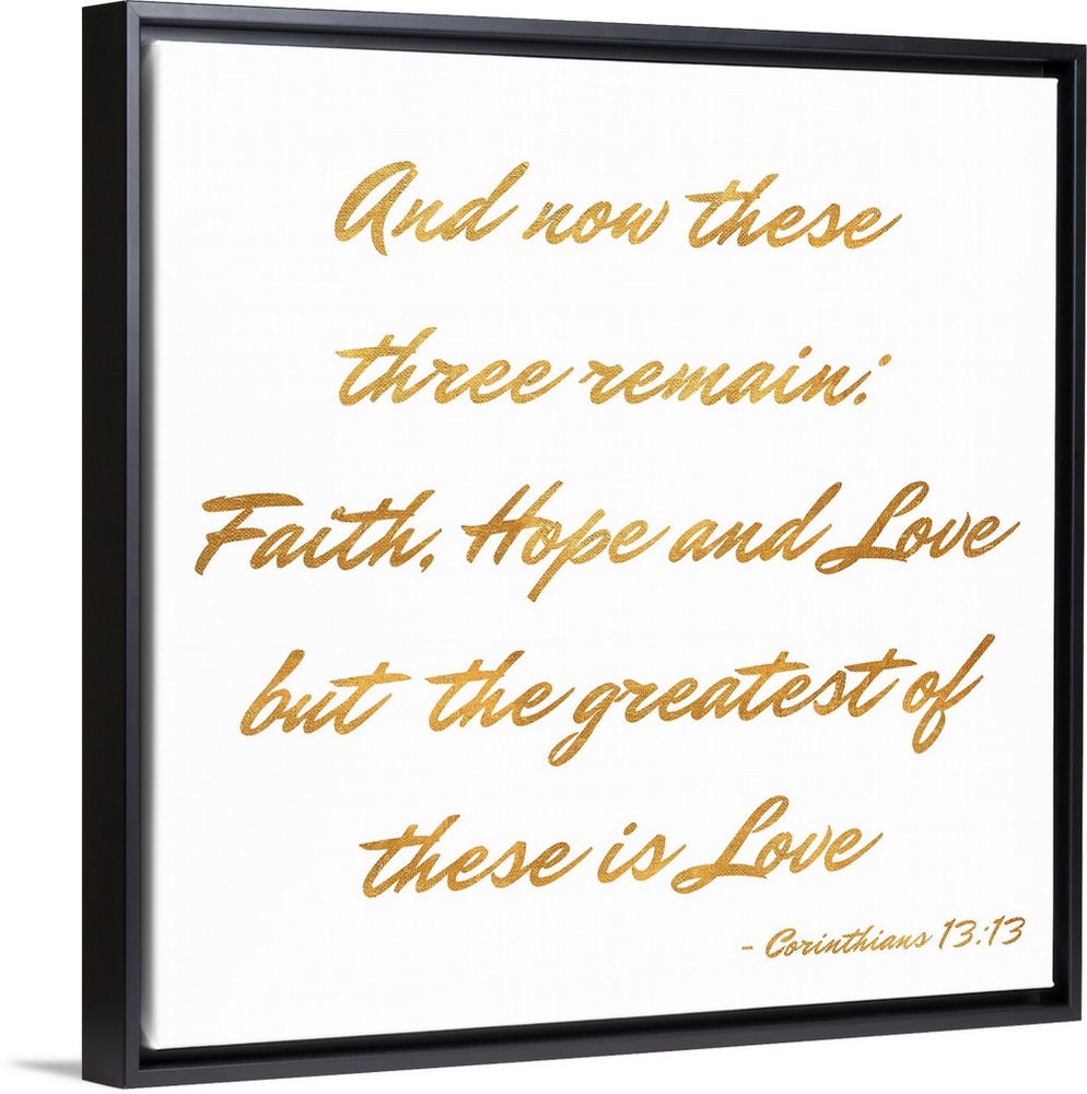 <p>"And Now These Three Remain: Faith, Hope, and Love But the Greatest of These is Love" Corinthians 13:13 written in gold on a solid white background.</p>