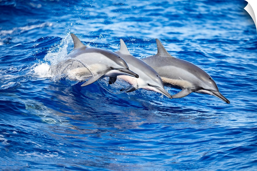 <p>Three Spinner dolphins (Stenella longirostris) leap out of the Pacific Ocean off the island of Lanai; Lanai, Hawaii, United States of America.</p>