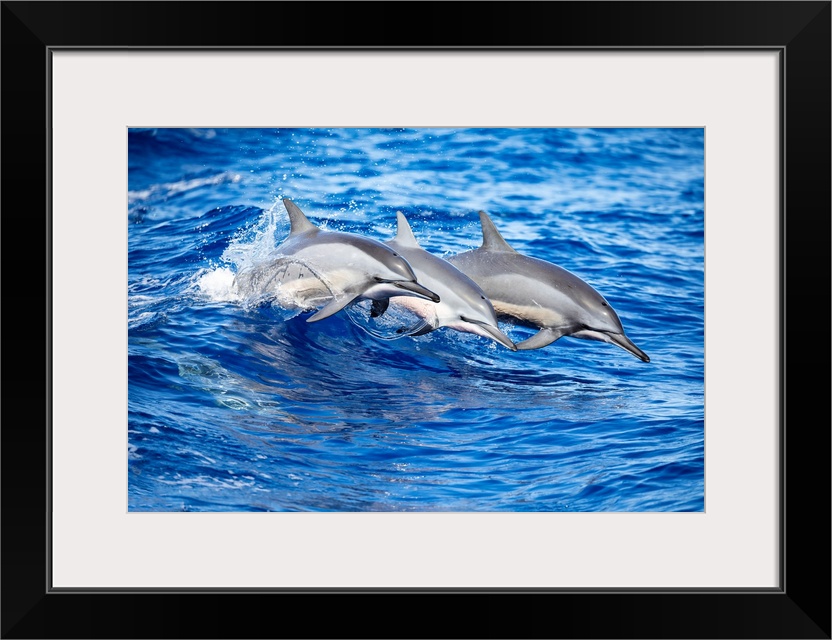 <p>Three Spinner dolphins (Stenella longirostris) leap out of the Pacific Ocean off the island of Lanai; Lanai, Hawaii, United States of America.</p>