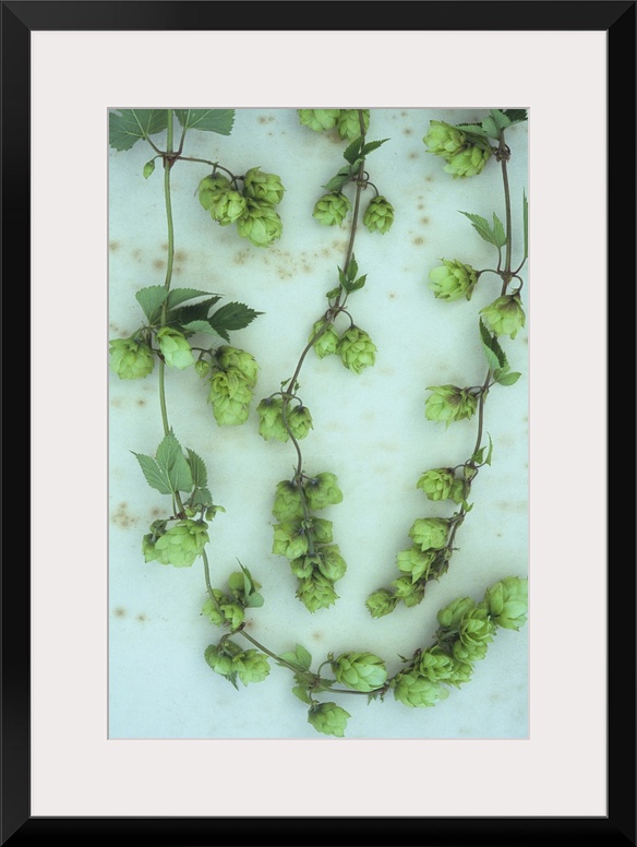 <p>Three stems of fresh green Hop or Humulus lupulus with leaves and scaly fruits developing lying on antique paper</p>