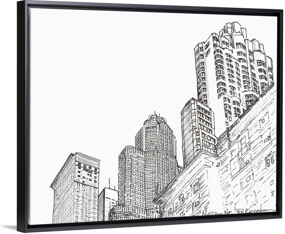 <p>Three Towers Midtown Manhattan, pen and ink drawing by RD Riccoboni. Skyscaper lined avenue in New York City.</p>