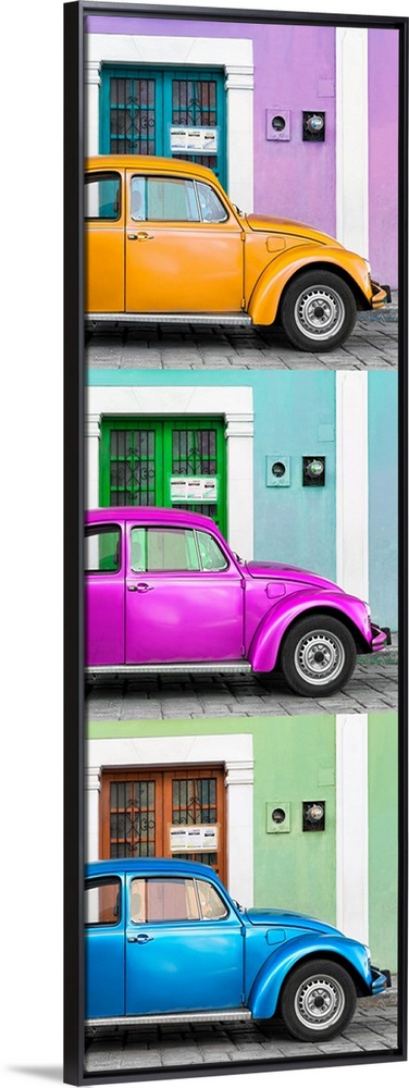 <p>Panoramic triptych photograph of three colorful Volkswagen Beetles parked in front of different brightly colored walls. From the Viva Mexico Panoramic Collection.</p>