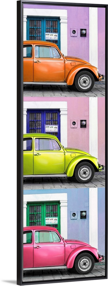 <p>Panoramic triptych photograph of three colorful Volkswagen Beetles parked in front of different brightly colored walls. From the Viva Mexico Panoramic Collection.</p>