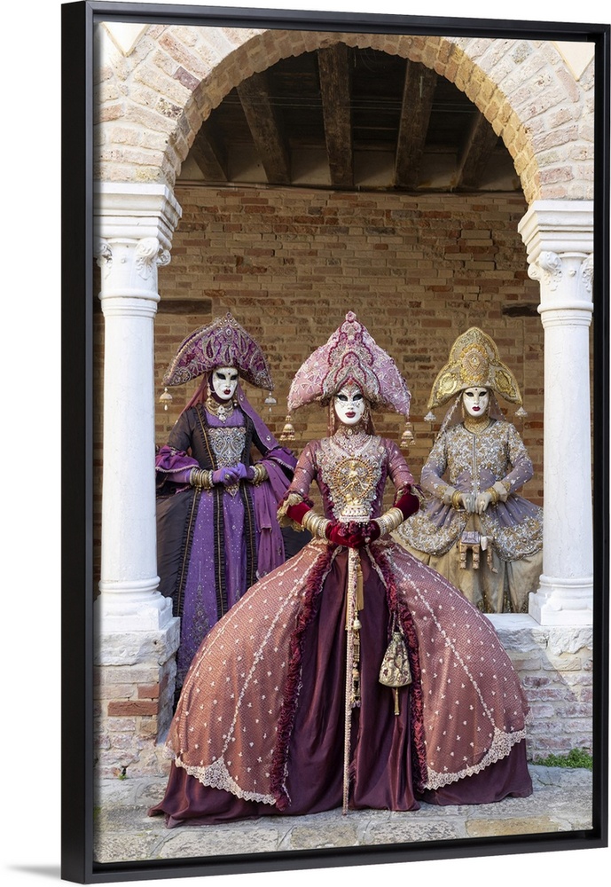 <p>Three women wearing Indian style costumes and masks pose in the cloisters of Chiesa di San Francesco della Vigna, Venice, Veneto, Italy</p>