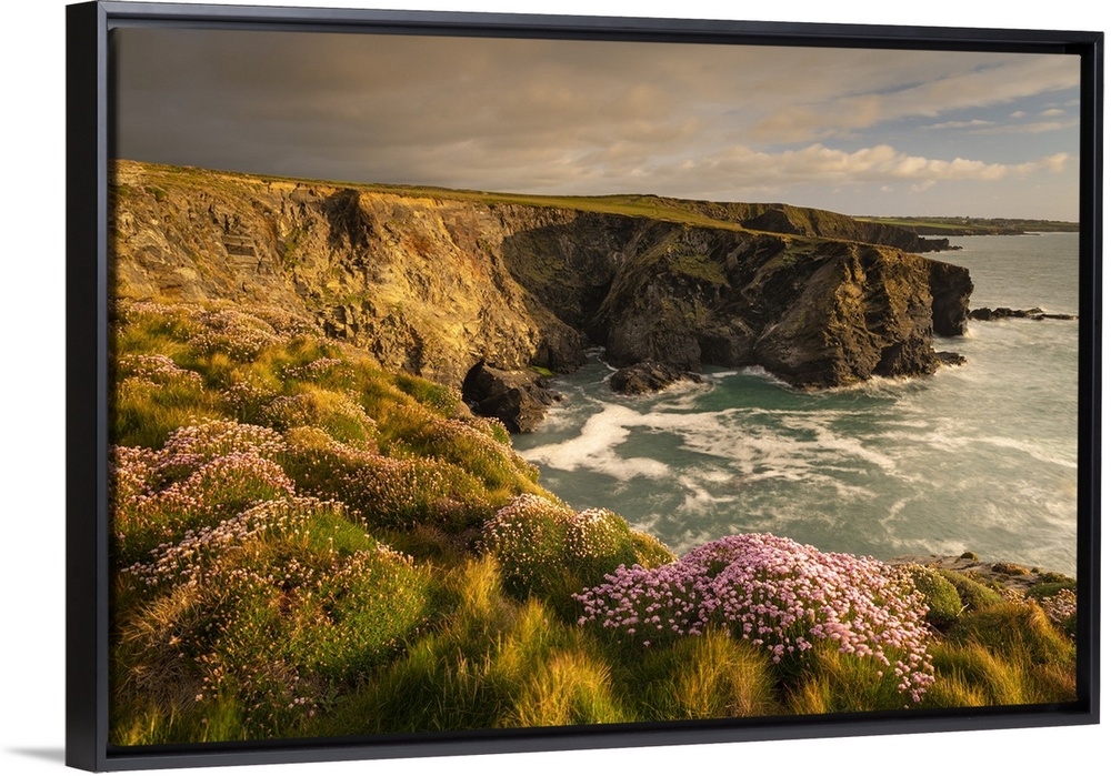 <p>Thrift wildflowers on the Cornish cliffs in springtime, Trevone, Cornwall, England. Spring, May 2021.</p>