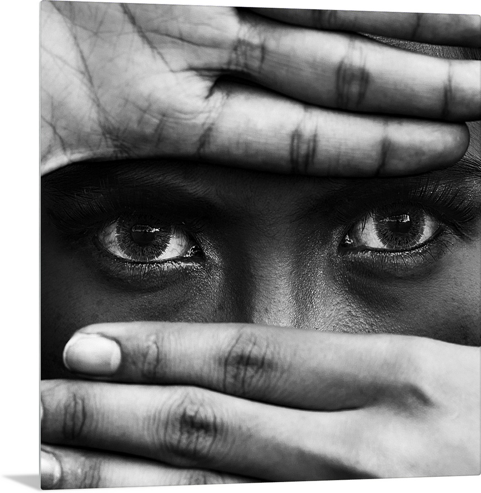 <p>A black and white portrait of a close-up of hands covering a persons leaving the eyes exposed.</p>