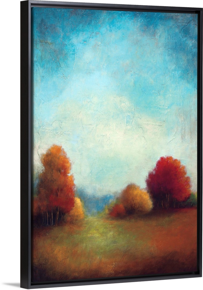 <p>Contemporary painting of a country scene in autumn with warm colored leaves on trees and a clear blue sky.</p>