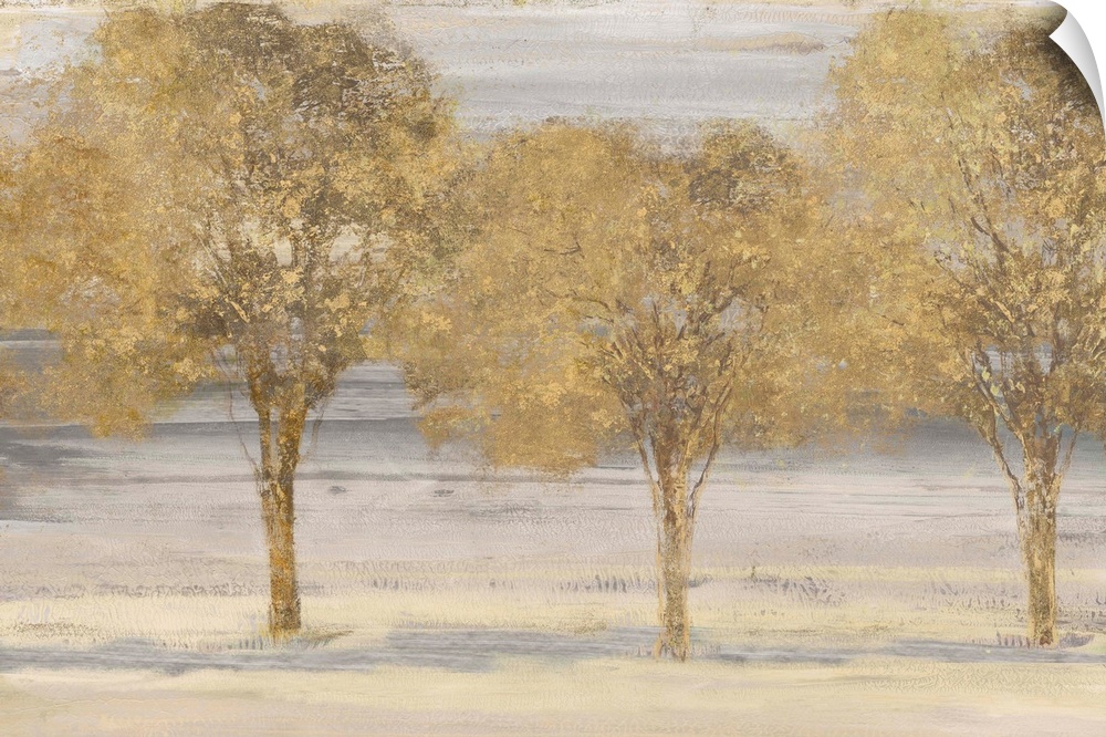 <p>Horizontal painting of a group of trees done in textured gold.</p>