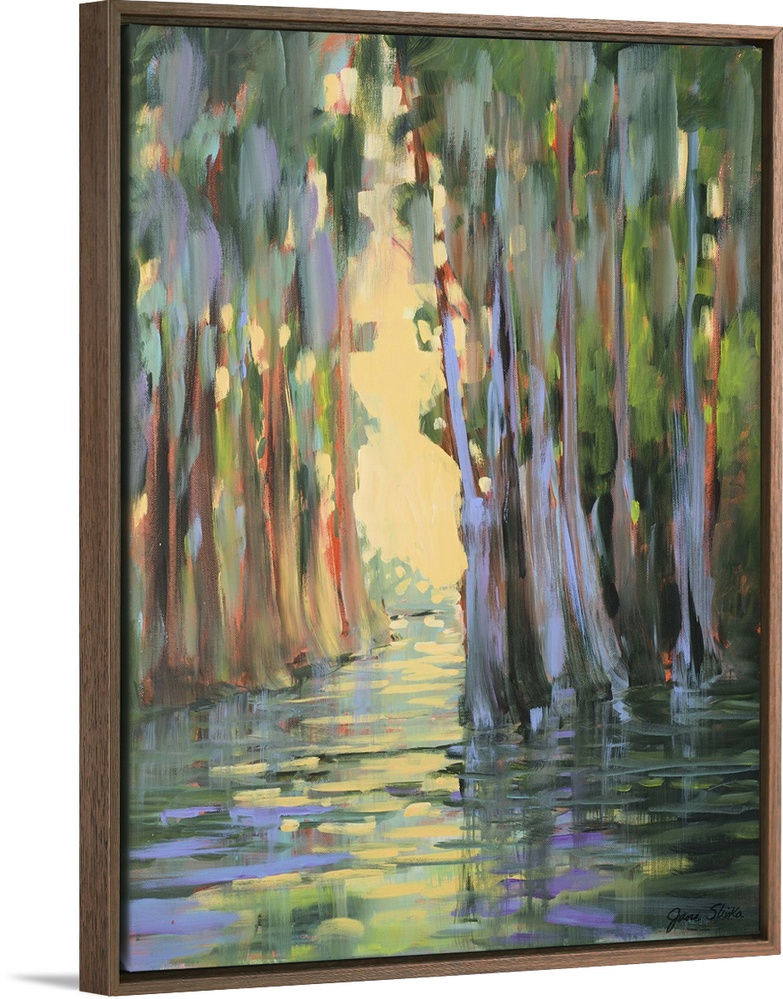 <p>Contemporary artwork of a swampy forest with golden sunlight.</p>