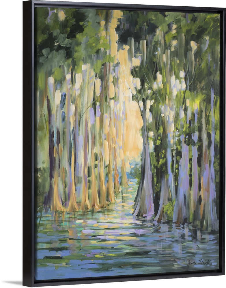 <p>Contemporary artwork of a swampy forest with golden sunlight.</p>