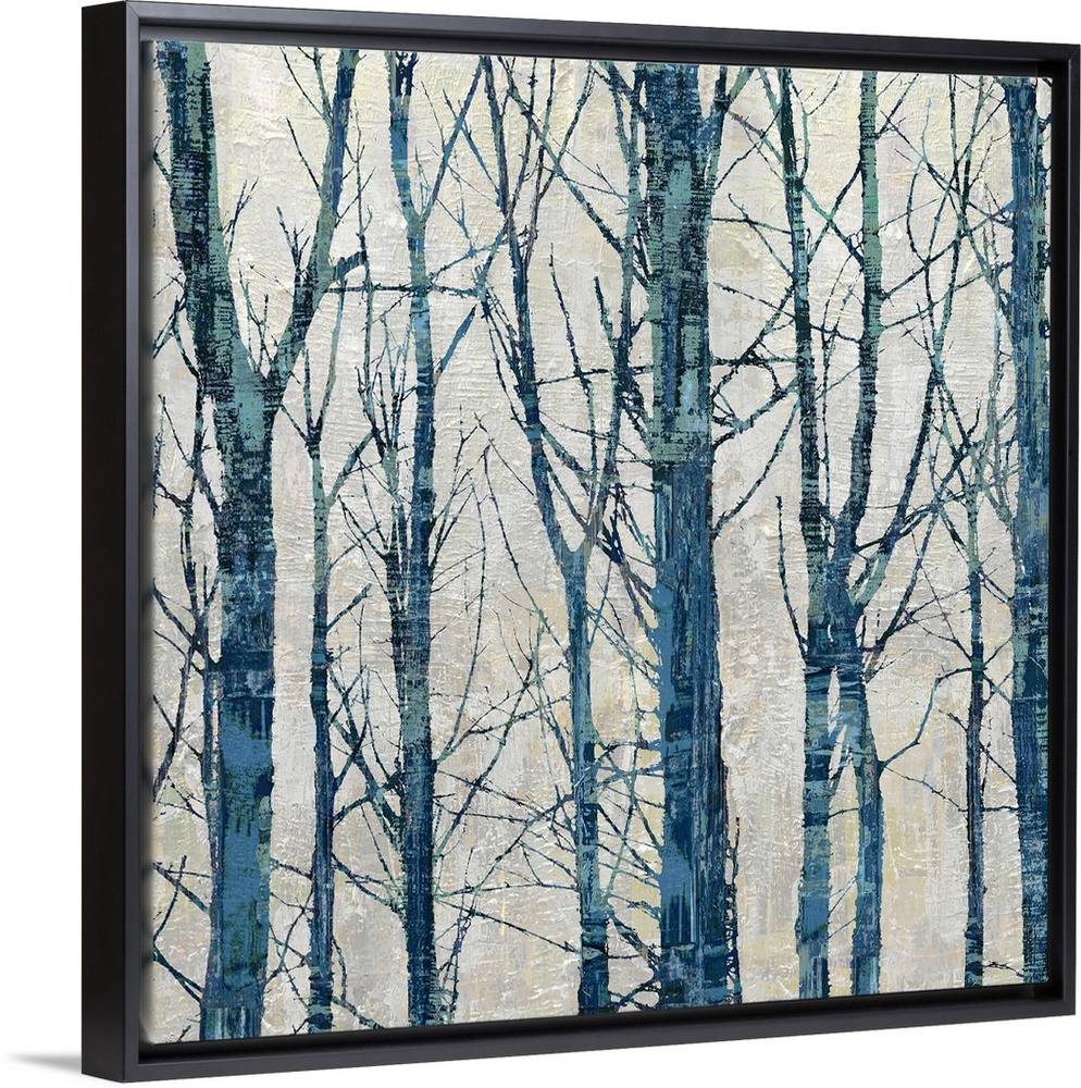 <p>Square decor with large thin trees in shades of blue on a neutral colored background.</p>