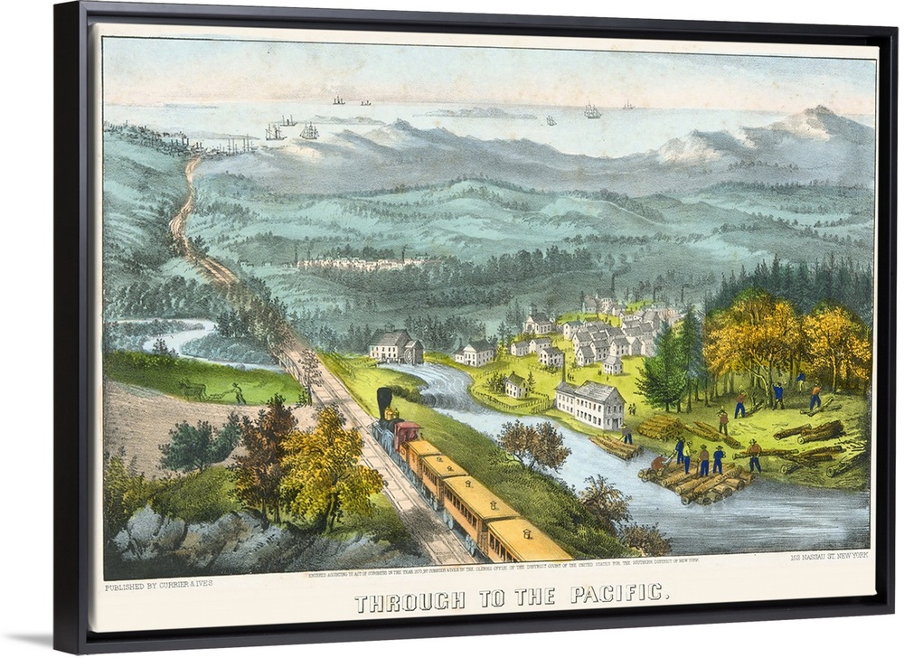 <p>Through to the Pacific, 1870 (originally hand-coloured lithograph) by Currier, N. (1813-88) and Ives, J.M. (1824-95)</p>