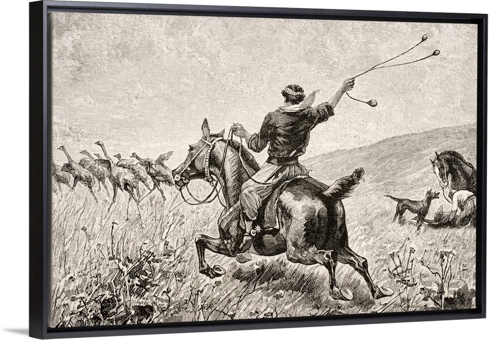 <p>Throwing the Bolas. Engraving from "Journal of Researches," by Charles Darwin, published by Nelson and Sons, 1890.</p>