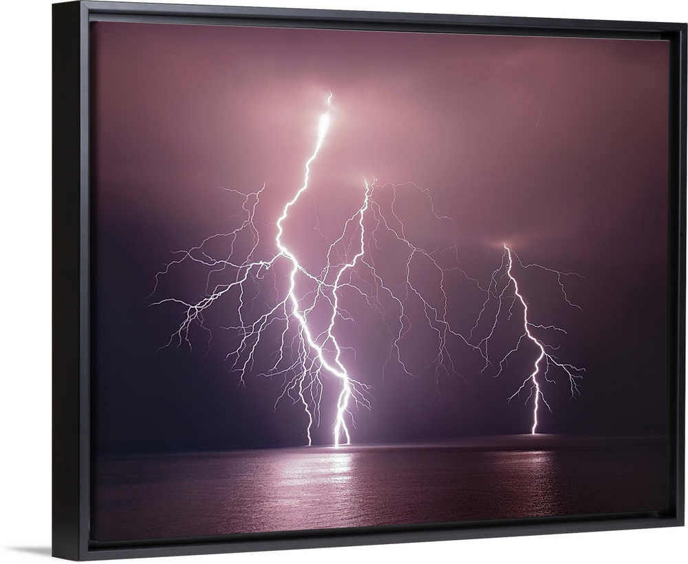<p>Dramatic image of three lightning bolts striking the ocean at night.</p>