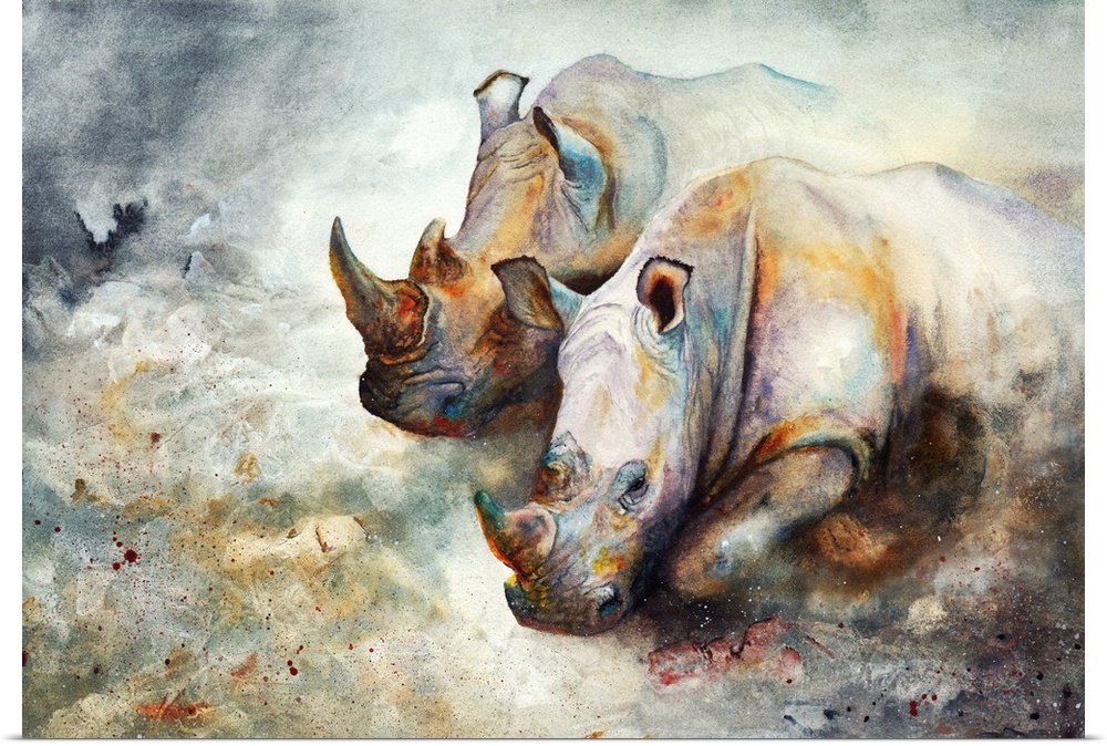 <p>An impressionistic painting of charging African rhino, created with watercolour and iridescent paints.</p>