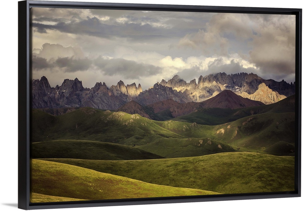 <p>Rolling green hills of and mountainous Tibetan valley, China.</p>
