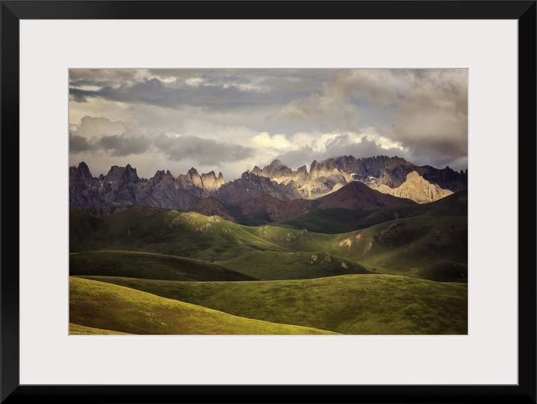 <p>Rolling green hills of and mountainous Tibetan valley, China.</p>