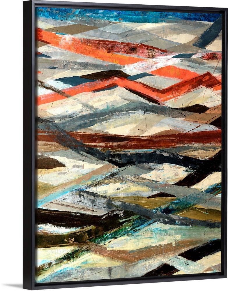 <p>Portrait, abstract painting of horizontal and zig zag lines in numerous colors. Painted with thick, rough brushstrokes.</p>