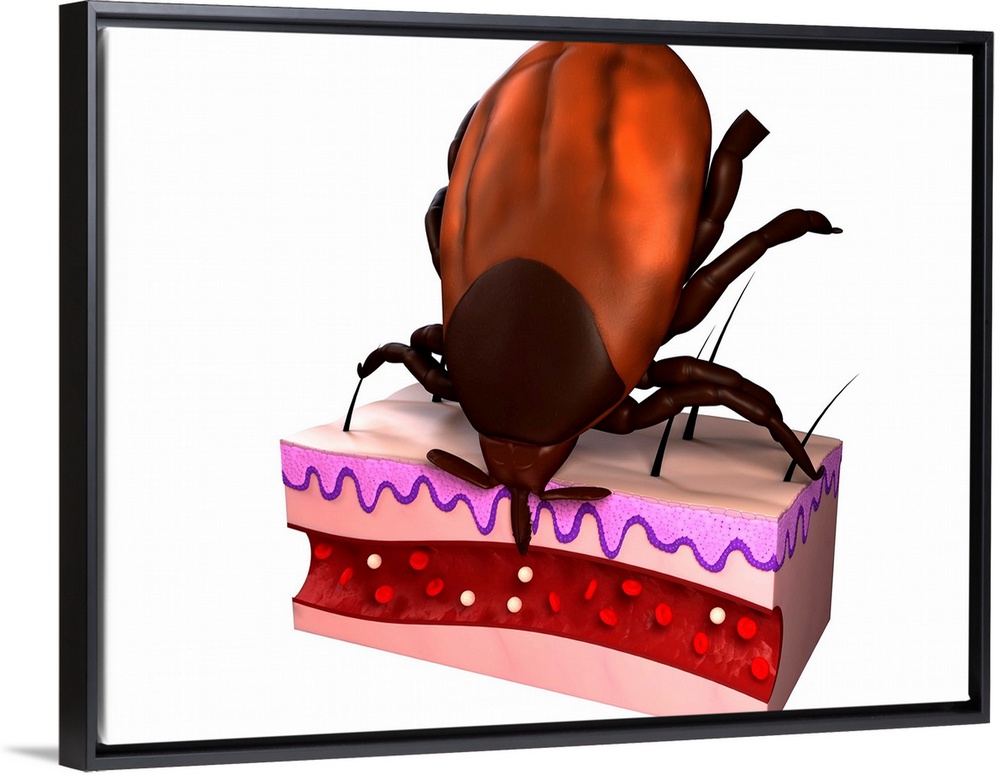 <p>Tick feeding. Computer artwork of a tick (superfamily Ixodoidea) feeding, showing a cross-section through skin.</p>
