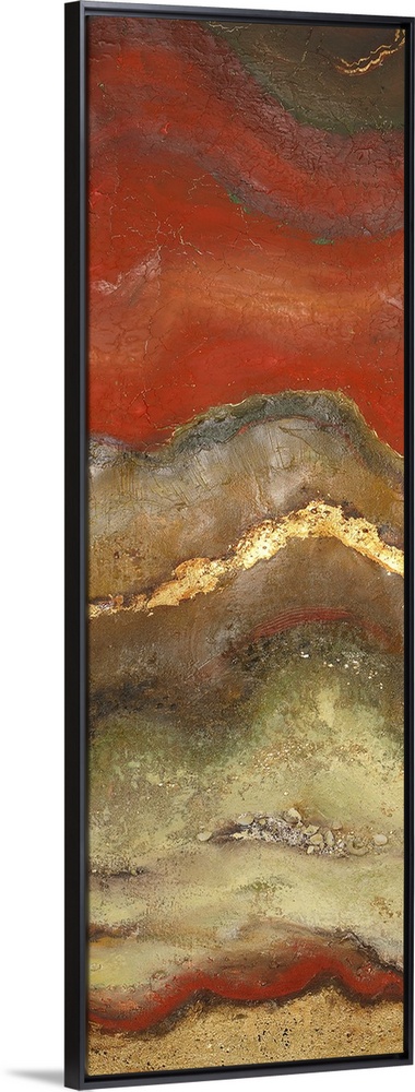 <p>This piece of abstract artwork has a rust like pattern with red mostly shown on top of the thin vertical print and neutral colors toward the bottom.</p>