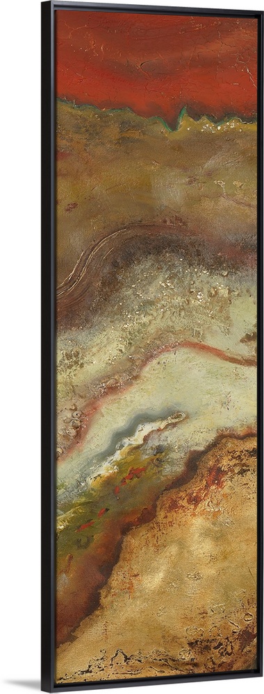 <p>Oversized, vertical, abstract art of jagged, horizontal layers of earth, in various earth tones, divided by squiggling, inconsistent lines.</p>