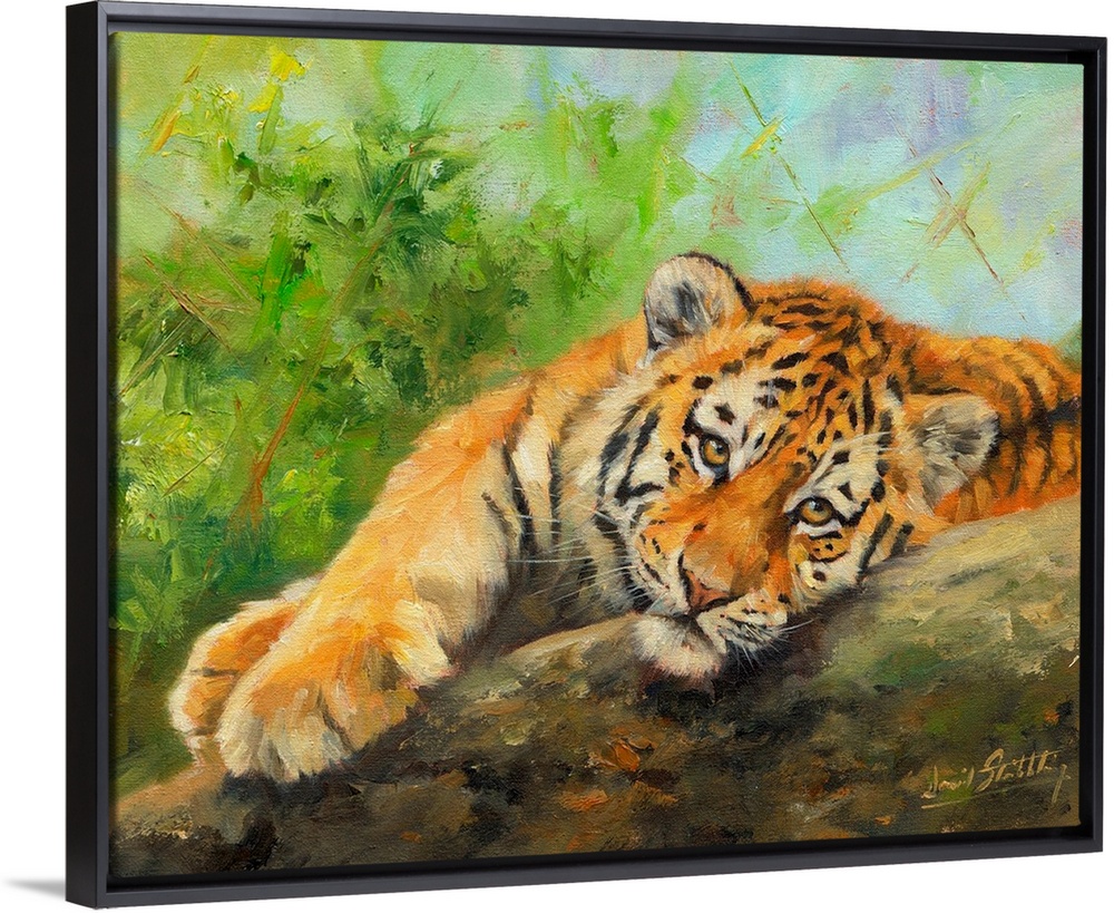 <p>Contemporary painting of a tiger cub lazily laying on a rock.</p>