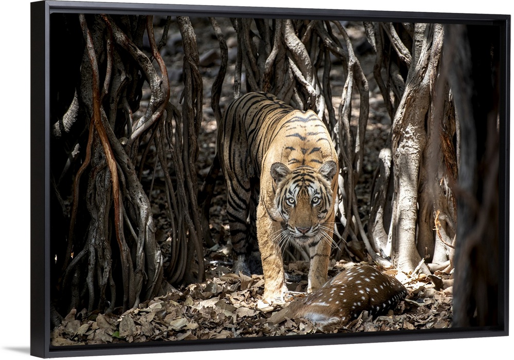 <p>Tiger retrieves her hunt hidden among a Banyan Tree in India.</p>