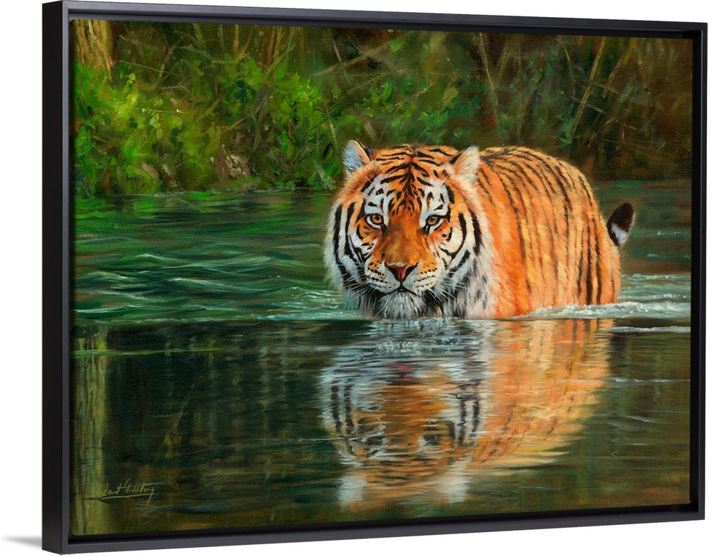 <p>Contemporary painting of a Siberian tiger wading through water.</p>