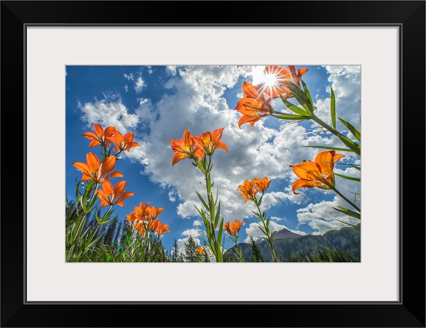 <p>Tiger Liliies (Lilium Columbianum) sway in the wind as the sun filters down through them, Canada.</p>
