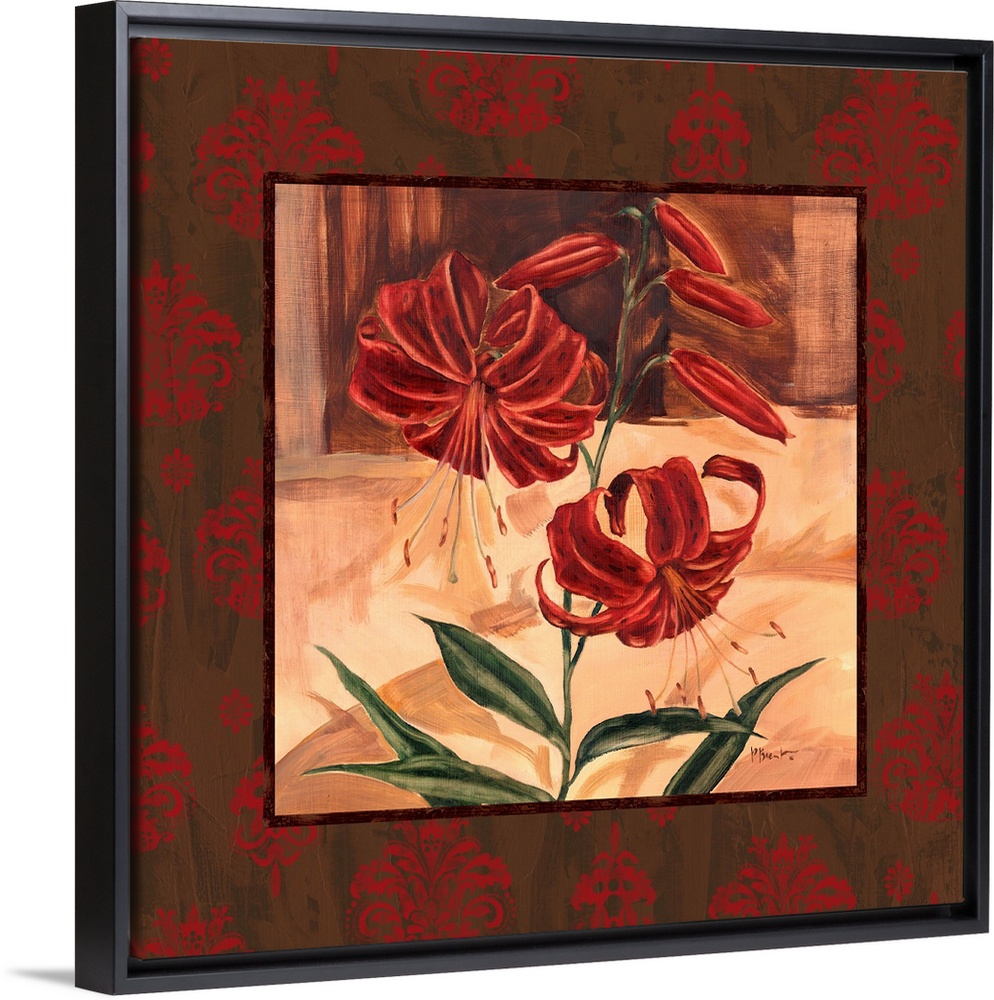 <p>Square painting of tiger lilies and buds with a border of damask-style flowers.</p>