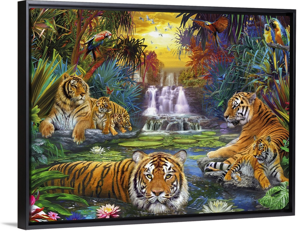 <p>Detailed painting on canvas of tigers sitting on rocks and bathing in a river in the jungle with waterfalls flowing in the background at sunset.</p>