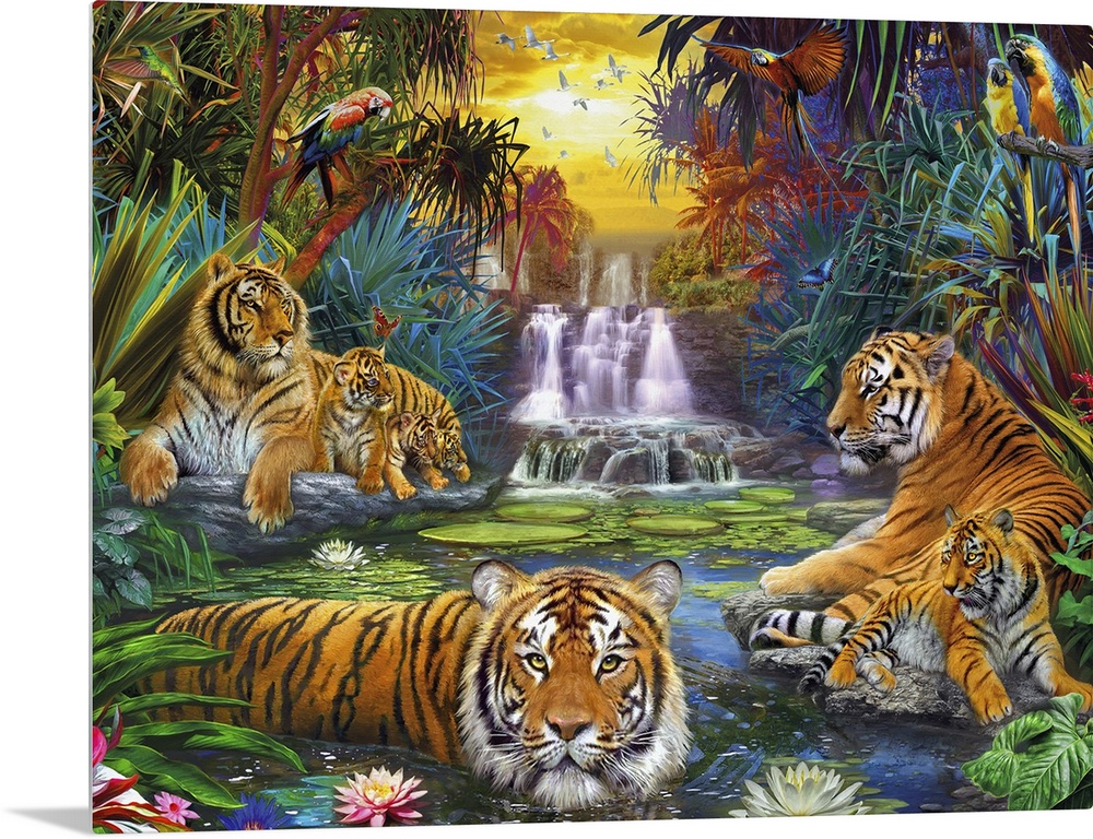 <p>Detailed painting on canvas of tigers sitting on rocks and bathing in a river in the jungle with waterfalls flowing in the background at sunset.</p>