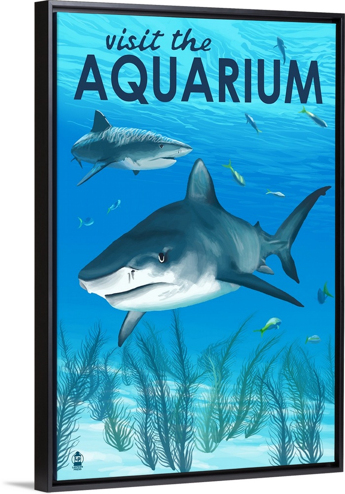 <p>Retro stylized art poster of two sharks swimming in clear blue water.</p>