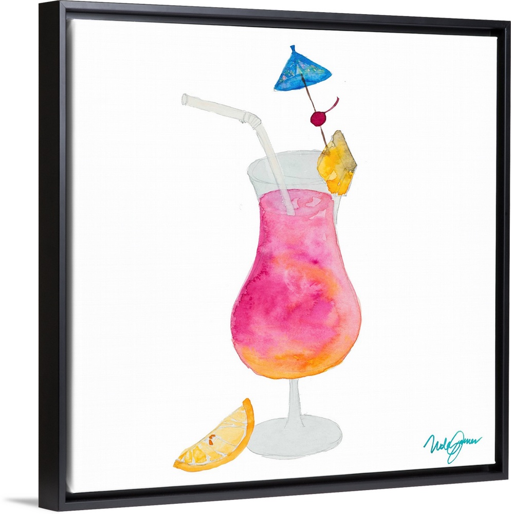 <p>Square watercolor painting of a tropical pink and orange cocktail in a daiquiri glass with a drink umbrella, cherry, pineapple on the rim, and an orange slice on the bottom.</p>