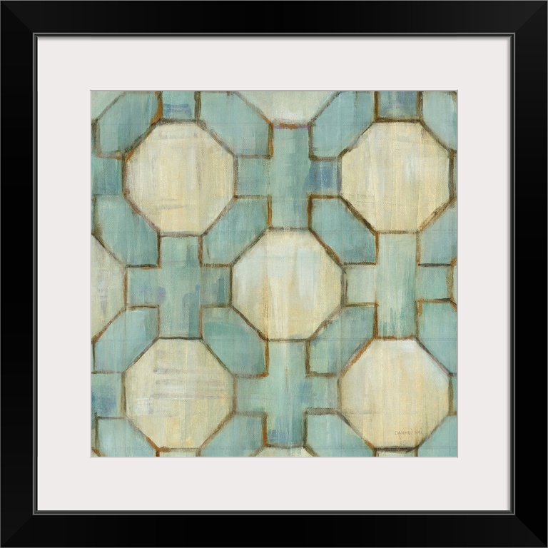 <p>Square abstract painting of a tiled design made up of hexagons and crosses with beige and teal hues.</p>