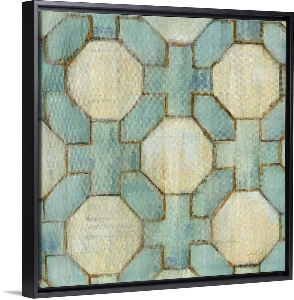 <p>Square abstract painting of a tiled design made up of hexagons and crosses with beige and teal hues.</p>