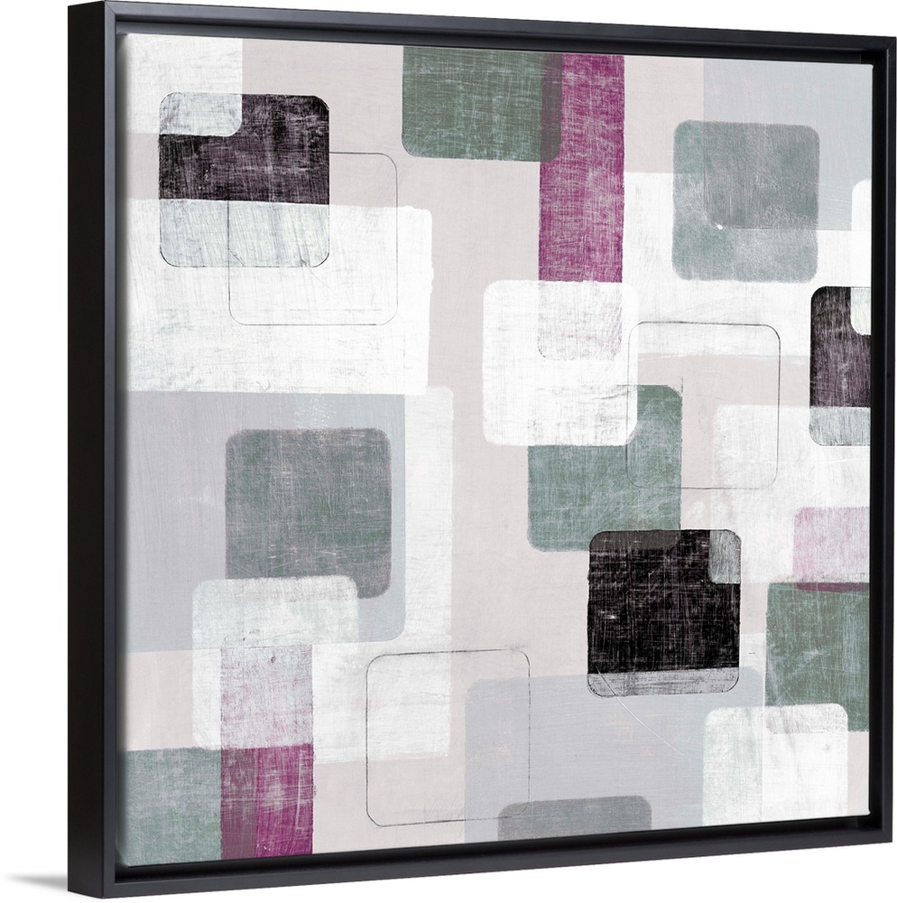 <p>Contemporary abstract painting using soft cornered geometric shapes floating in space against a neutral background.</p>