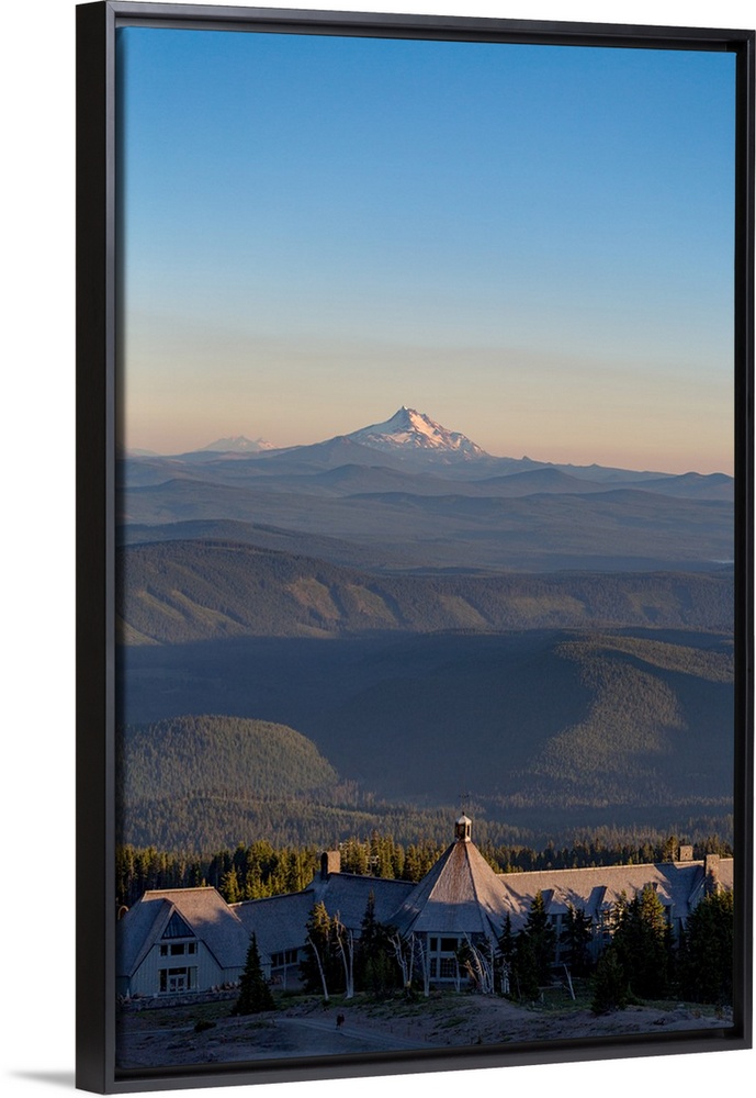 <p>Timberline Lodge hotel and Mount Jefferson seen from Mount Hood, part of the Cascade Range Northwest region, Oregon</p>