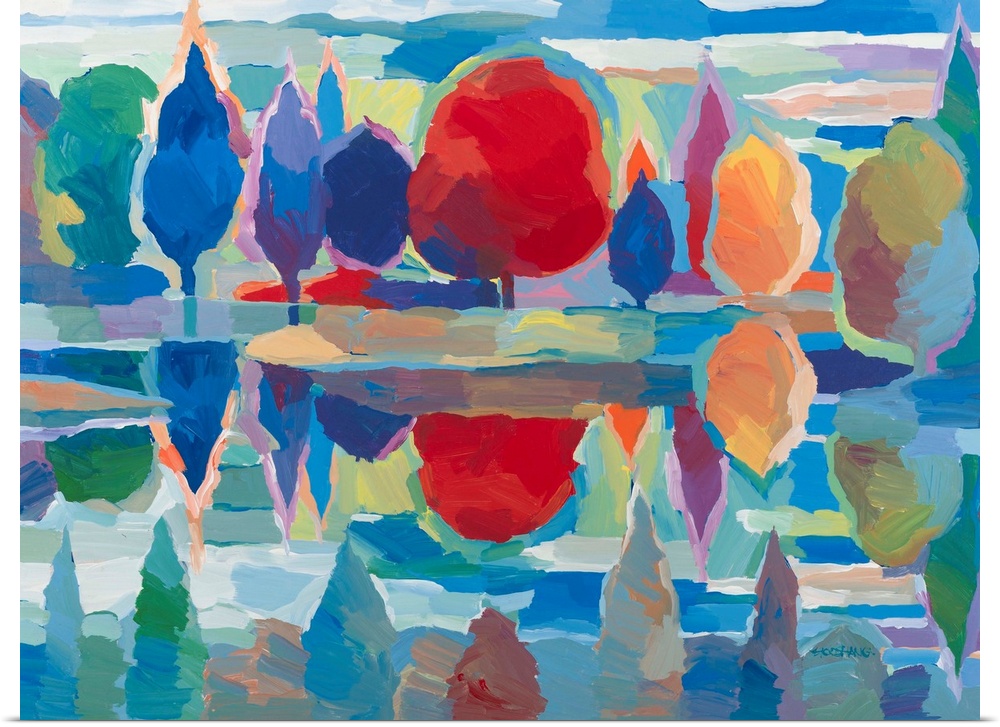 <p>Colorful abstract landscape with trees reflecting into the lake in front of them.</p>