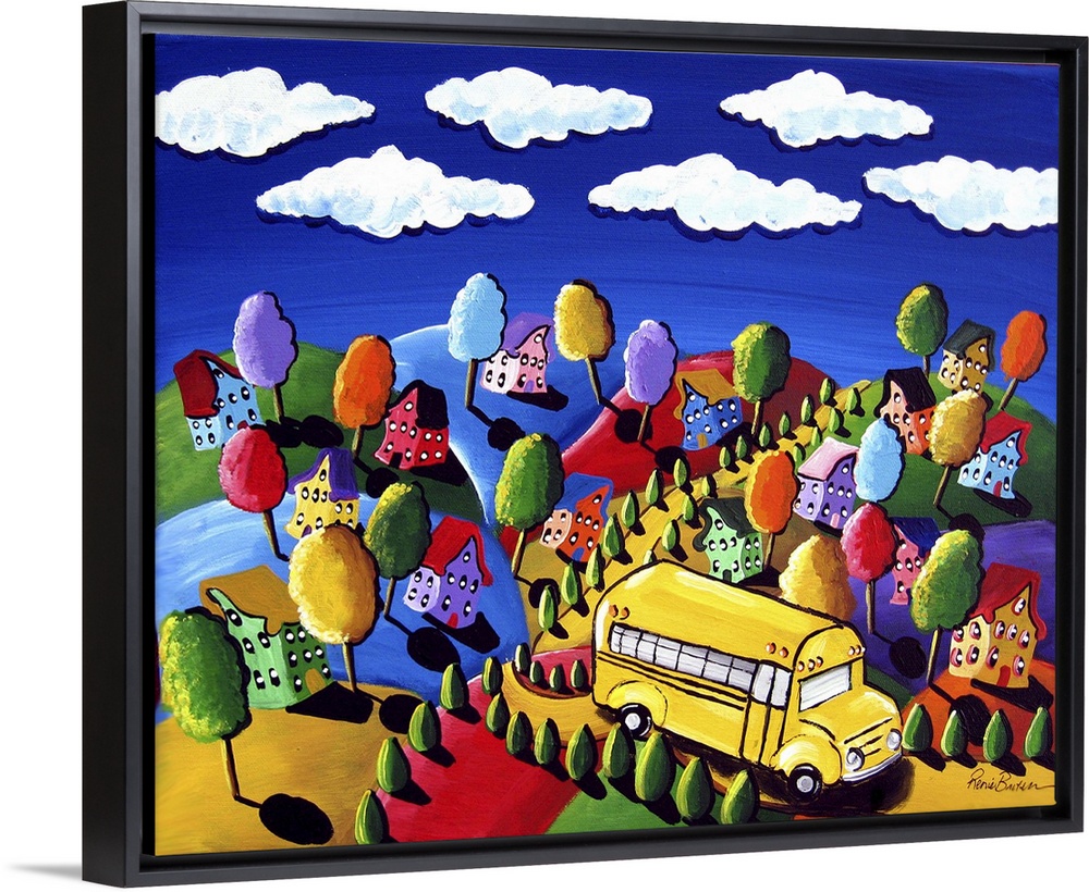 <p>The school bus makes it way through the colorful landscape, picking up the children.</p>