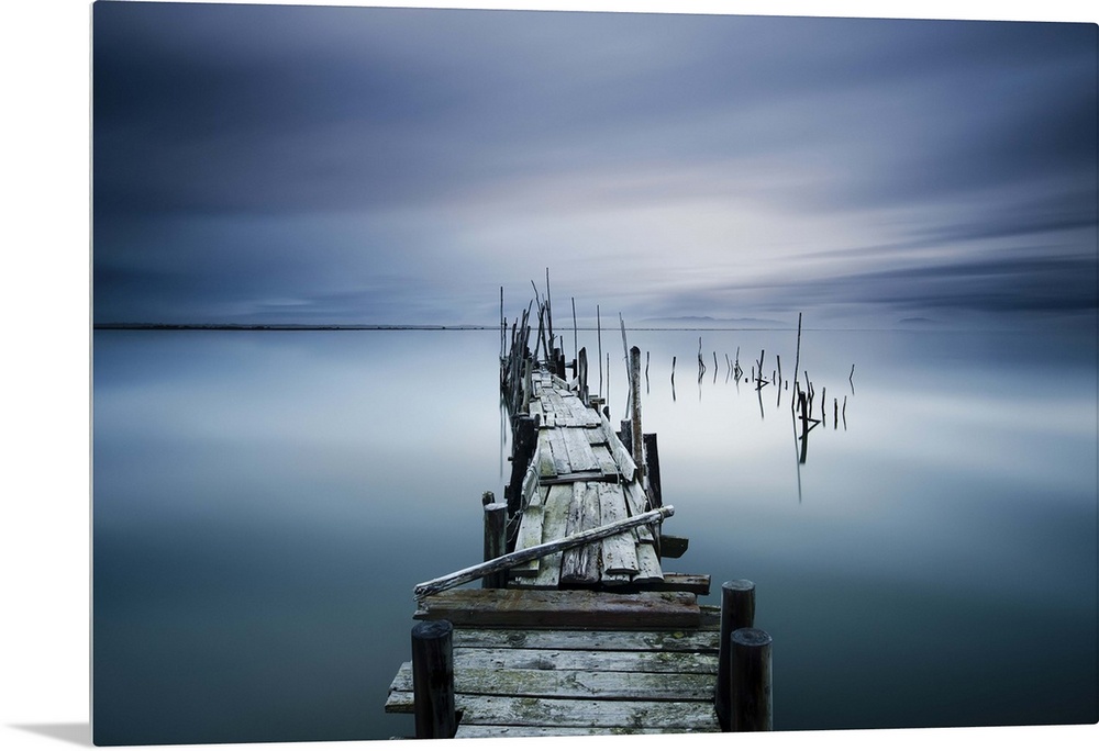 <p>A weathered wooden pier over the calm waters in Carrasquiera, Portugal.</p>