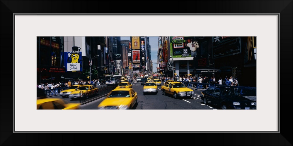 <p>Wide angle photograph of many taxi cabs rushing through the streets, surrounded by the large advertising signs of Times Square in New York City, during the day.</p>