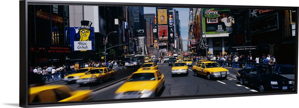 <p>Wide angle photograph of many taxi cabs rushing through the streets, surrounded by the large advertising signs of Times Square in New York City, during the day.</p>