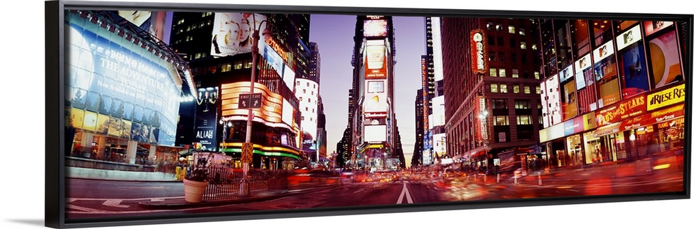 <p>Part of Times Square is photographed in panoramic view while it's illuminated under the dusk sky.</p>