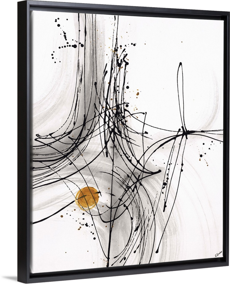 <p>Abstract painting using thin black lines to create fluid movement, with a little gold circle towards the bottom of the image.</p>