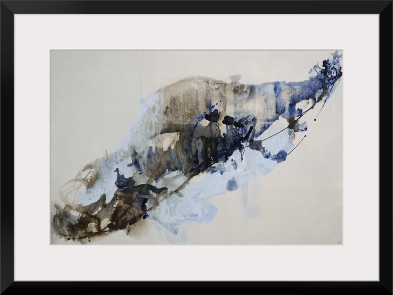 <p>Contemporary abstract painting in dark black and light blue in the center of grey space.</p>