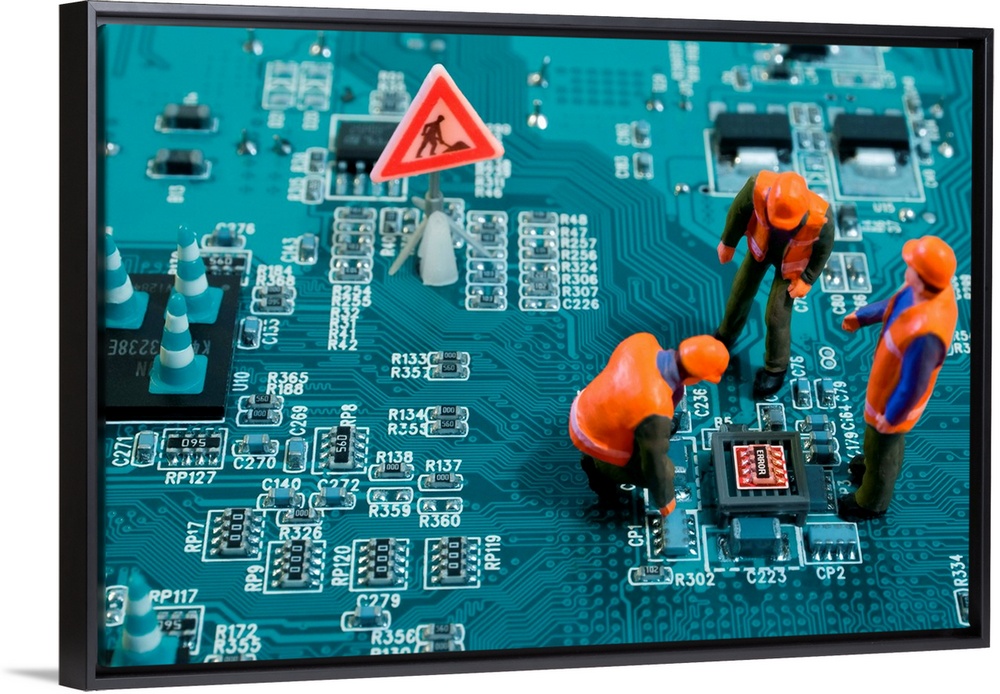 <p>Miniature Engineers Fixing Error On Chip Of Motherboard</p>