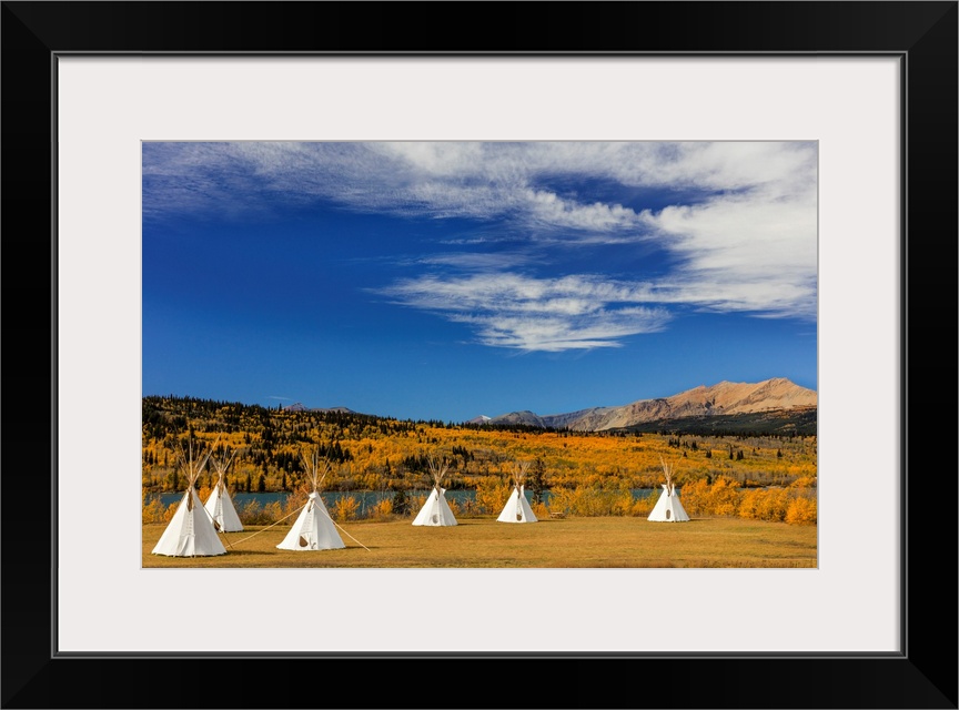 <p>Tipis with Yellow Mountain in background at Chewing Black Bones campground near St Mary, Montana, USA</p>