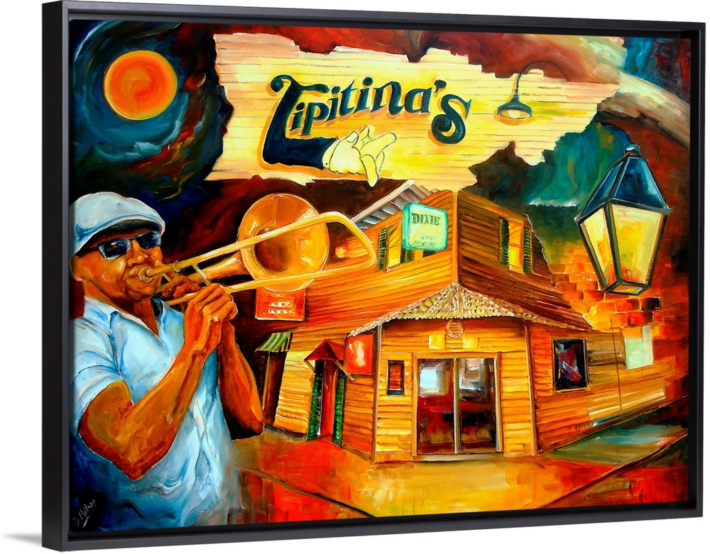 <p>Contemporary artwork of a New Orleans restaurant with a man painted to the left playing the trombone.</p>